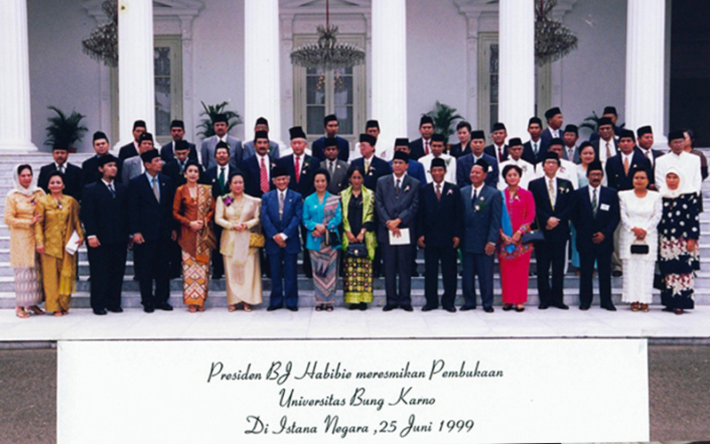 Presiden Republik Indonesia Ketiga Prof. Dr. Ing. H. Bacharuddin Jusuf Habibie, FREng berkenan meresmikan berdirinya Universitas Bung Karno di Istana Negara.